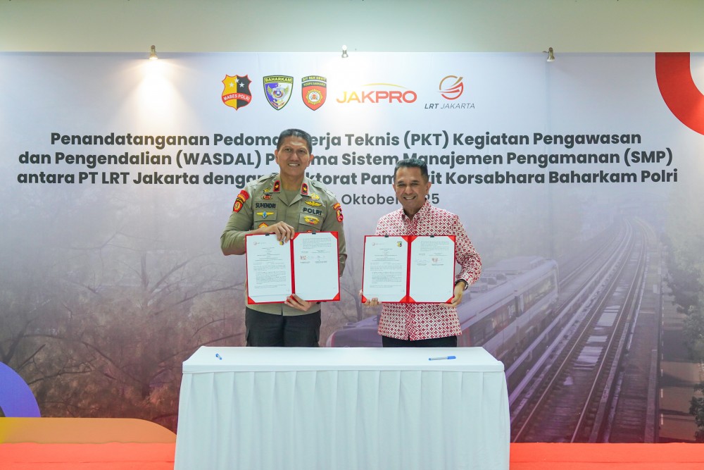 Kamis, 16 Oktober 2025 – PT LRT Jakarta menggelar kegiatan Penandatanganan Perjanjian Kerja Teknis (PKT) Pengawasan dan Pengendalian (Wasdal) Pertama Sistem Manajemen Pengamanan (SMP) yang merupakan Objek Vital Nasional (Obvitnas) di Gedung MCC PT LRT Jakarta. Kegiatan yang dihadiri oleh jajaran kepolisian Republik Indonesia, jajaran Dinas Perhubungan DKI Jakarta, serta manajemen PT LRT Jakarta ini bertujuan memperkuat penerapan sistem pengamanan yang terintegrasi dan berstandar nasional di seluruh lingkungan operasional LRT Jakarta.
